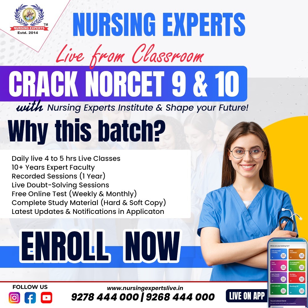 🚨 Attention Nursing Aspirants!🚨 Get ready to ace NORCET & other Nursing exams with Nursing Experts! We are launching our First Live from Classroom Batch at our Patel Nagar (Main Branch) starting 3rd April. अब पढ़ें घर बैठे Nursing Experts की Main Branch से Direclty Live, जहां से होते है सबसे ज्यादा Selections ✅ Daily Live Classes(5 to 6 hrs) ✅ Recorded Classes (Access for 1 Year) ✅ Comprehensive Study Material (Hardcopies & Softcopies) ✅ Test Series & Doubt Sessions ✅ Expert Mentorship Join directly from the classroom that has helped 15,000+ students achieve success! Fees - Rs 11999 till 3rd April, After that 19999 📍 Location: Patel Nagar (Main Branch) 📅 Batch Starts: 3rd April Seats are Limited! Don't miss this golden opportunity. Enroll now and take your preparation to the next level! For more details, contact us today! 📞 9278-444-000